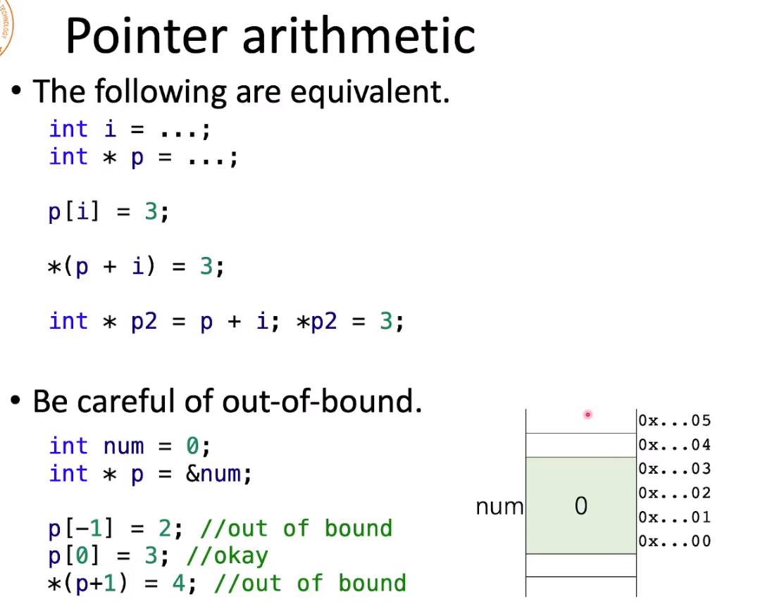 下面的p[0] 表示了num这个位置,但是p[-1]就表示是num的前面四个字节,是无法估计的。虽然他没有编译出错,但是内存上已经有问题了。